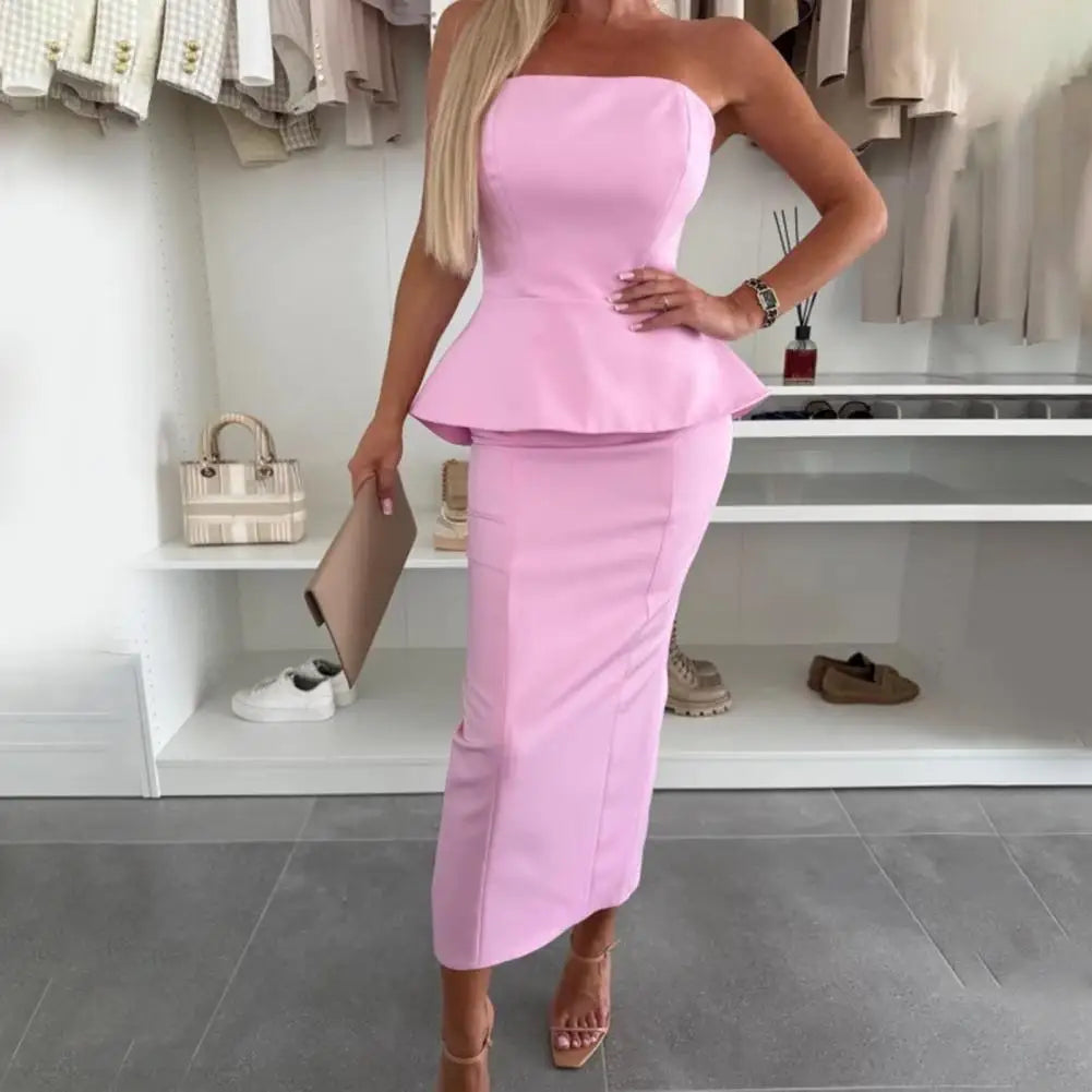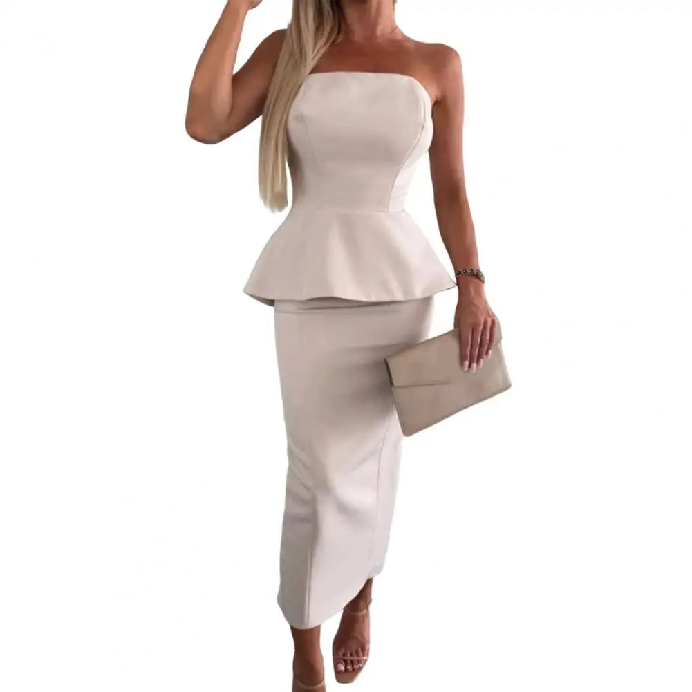 2 Pcs/Set Women Top Skirt Suit for Prom Wedding Off Shoulder Backless Bandeau A-line Top Slim Fit Sheath Slit Skirt Formal Party Outfit