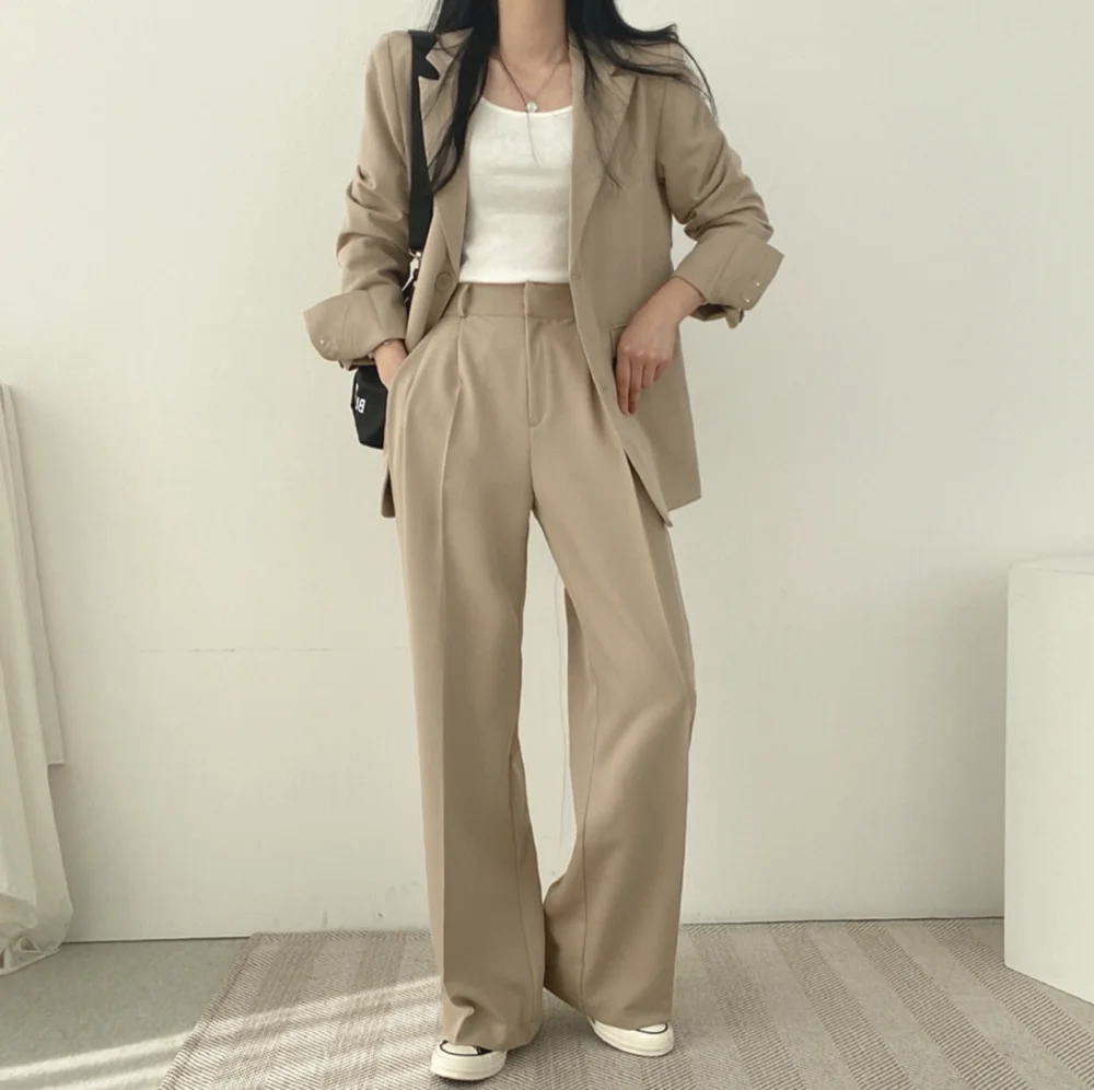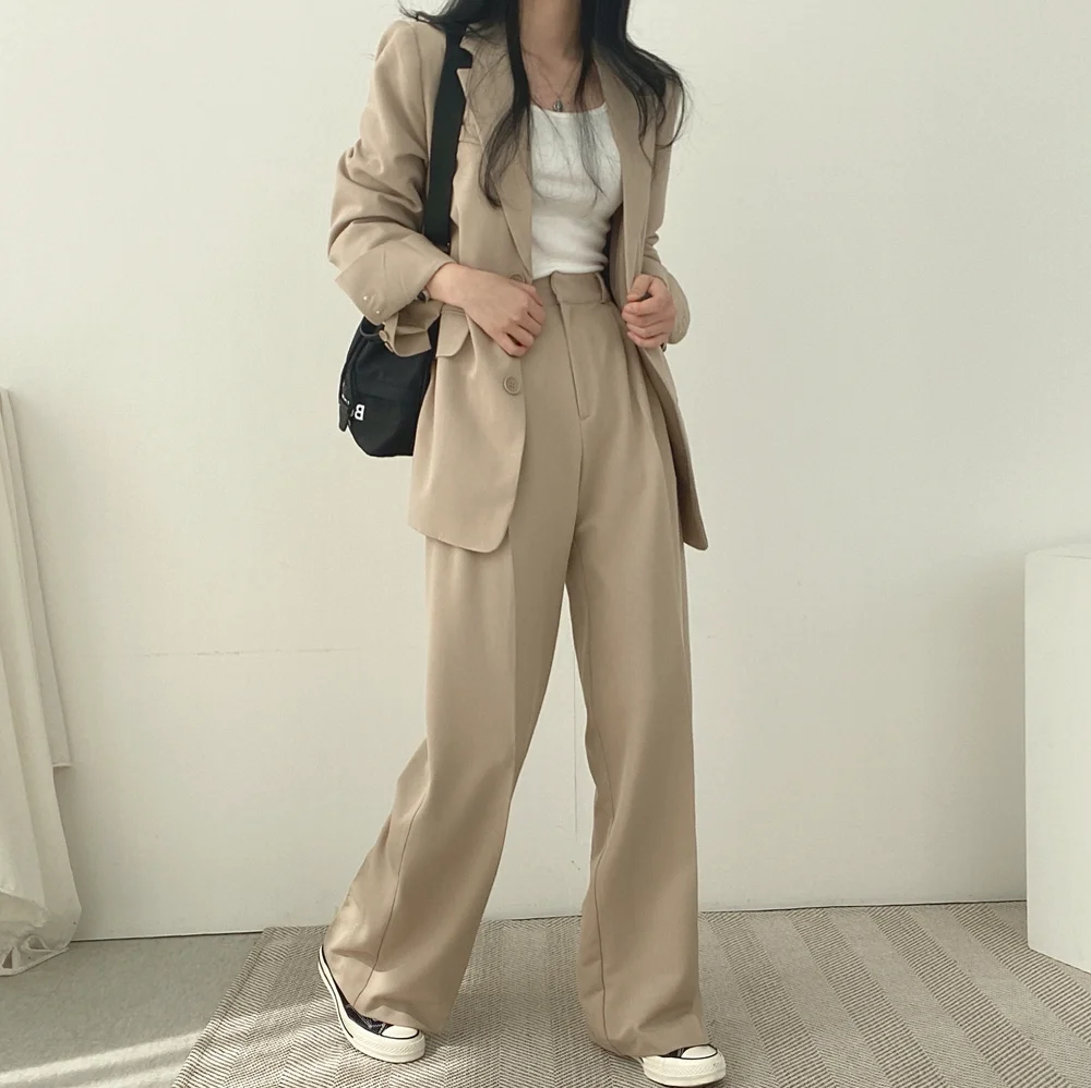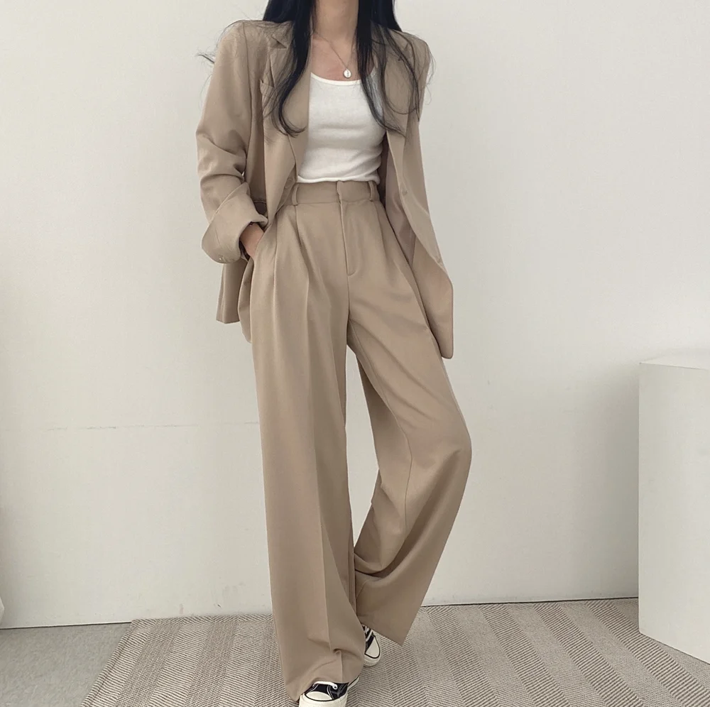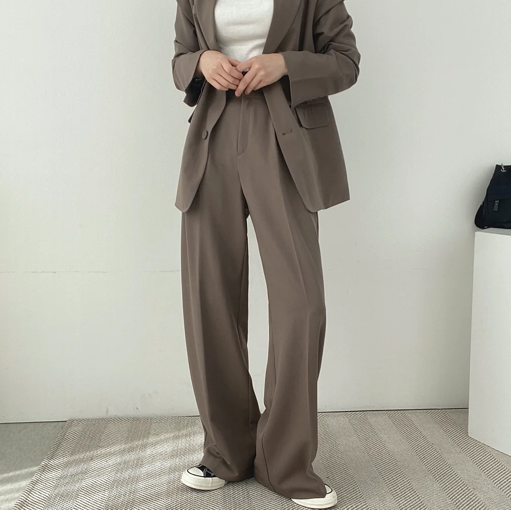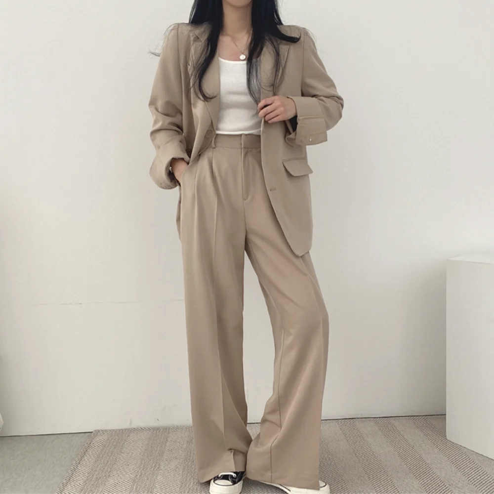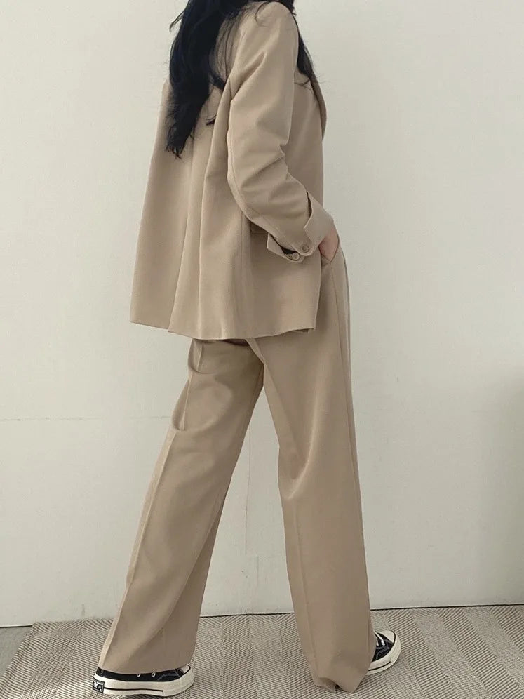 Embrace the latest Korean fashion trend with this chic, casual boyfriend-style pure color suit jacket and high-waisted, floor-length wide-leg pants set for women.