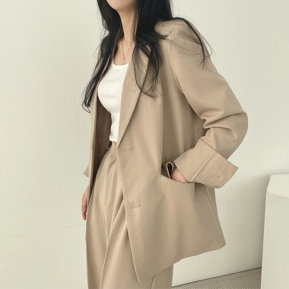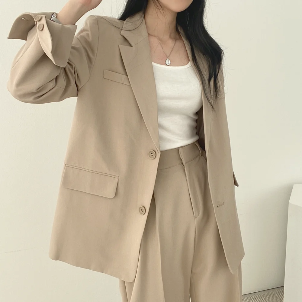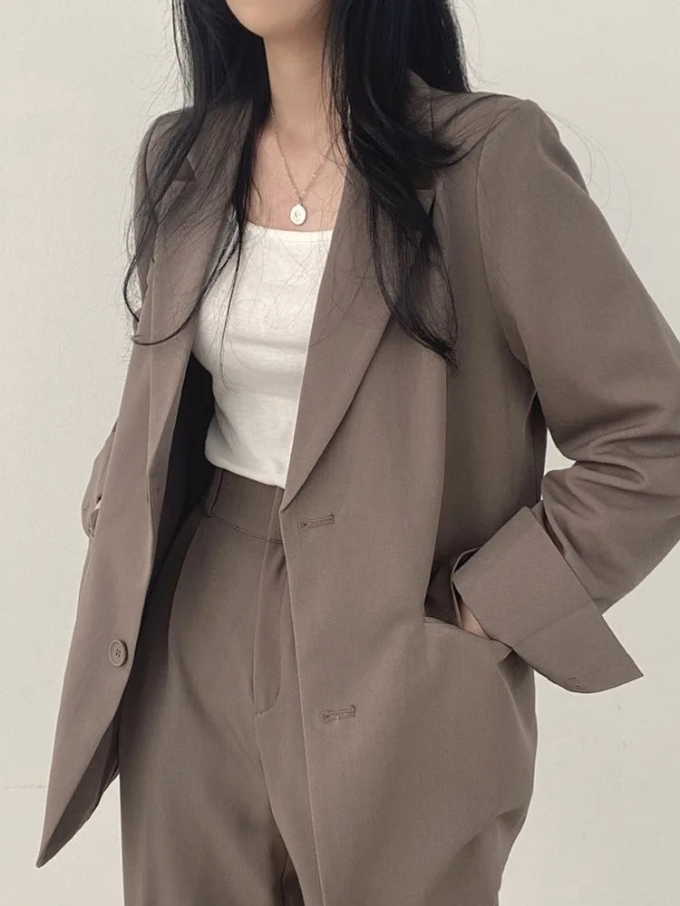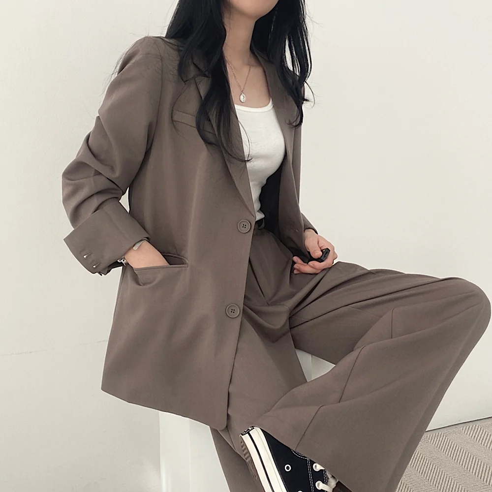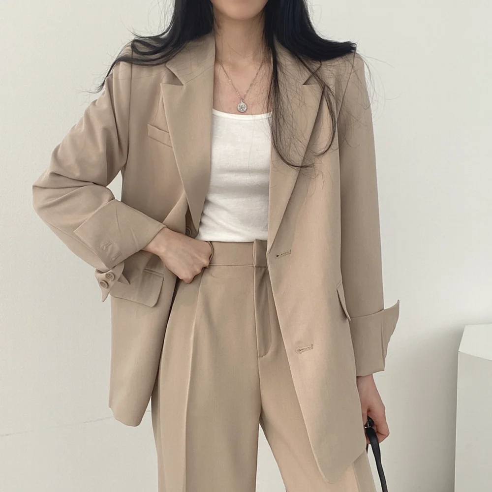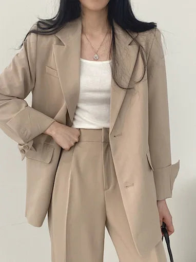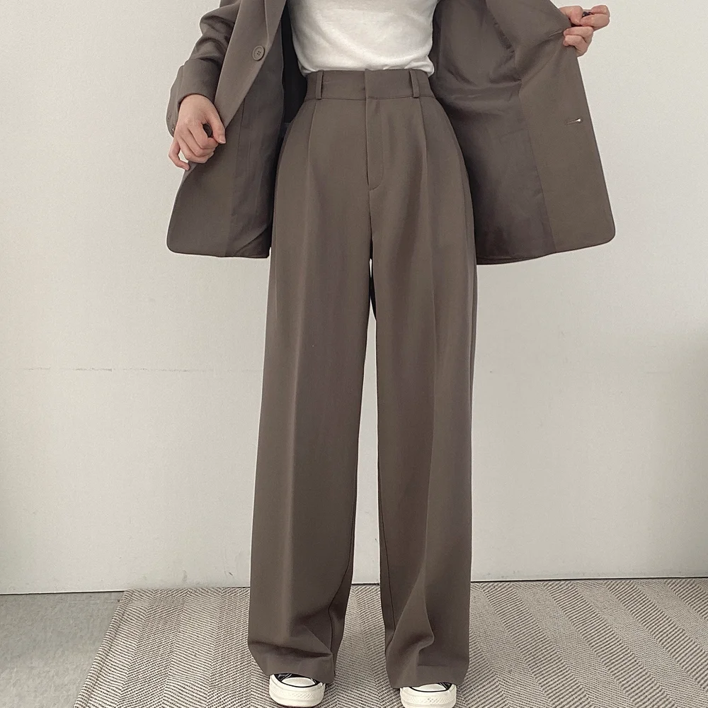 Embrace the latest Korean fashion trend with this chic, casual boyfriend-style pure color suit jacket and high-waisted, floor-length wide-leg pants set for women.