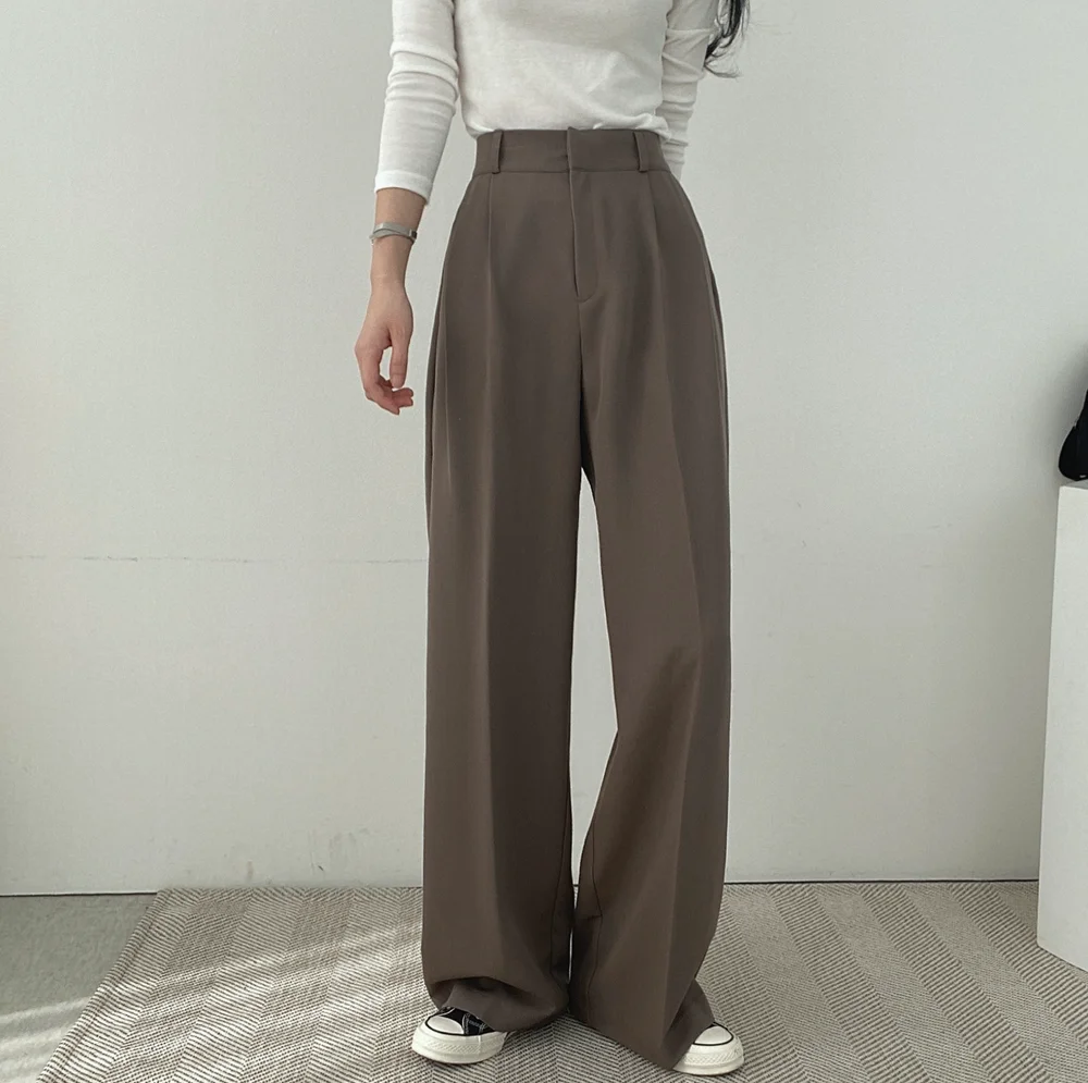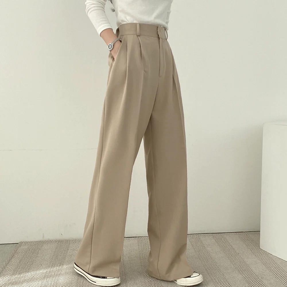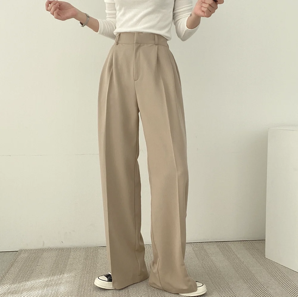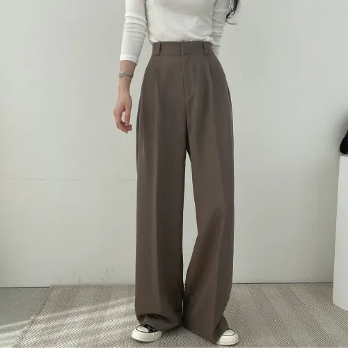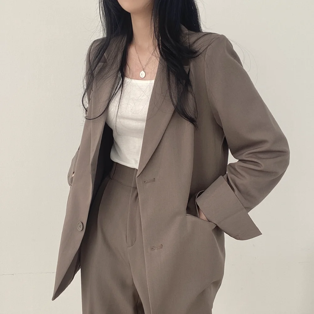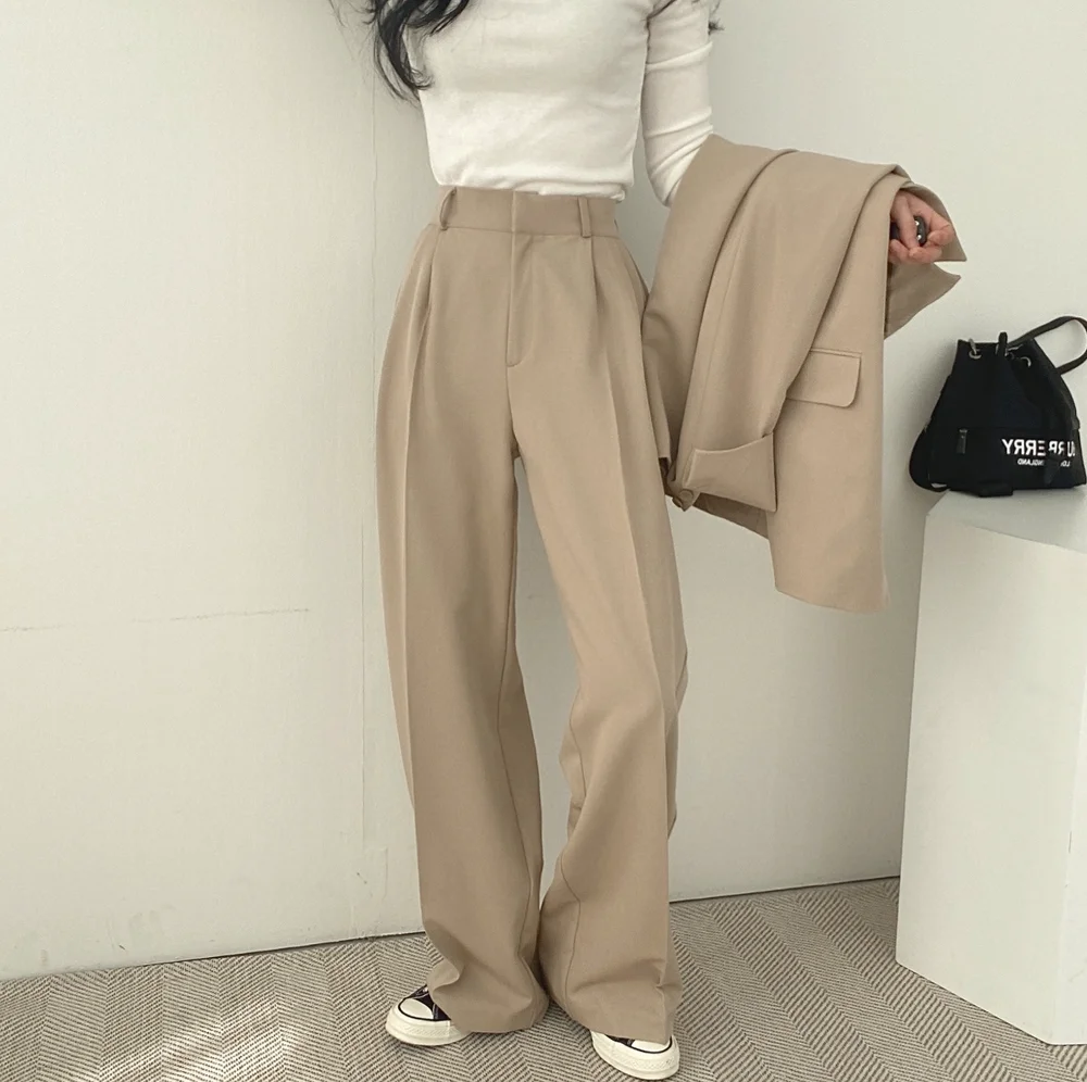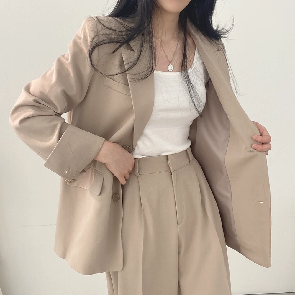 Embrace the latest Korean fashion trend with this chic, casual boyfriend-style pure color suit jacket and high-waisted, floor-length wide-leg pants set for women.
