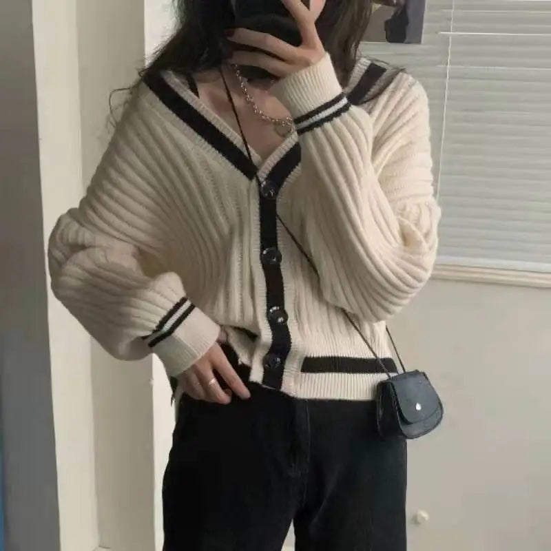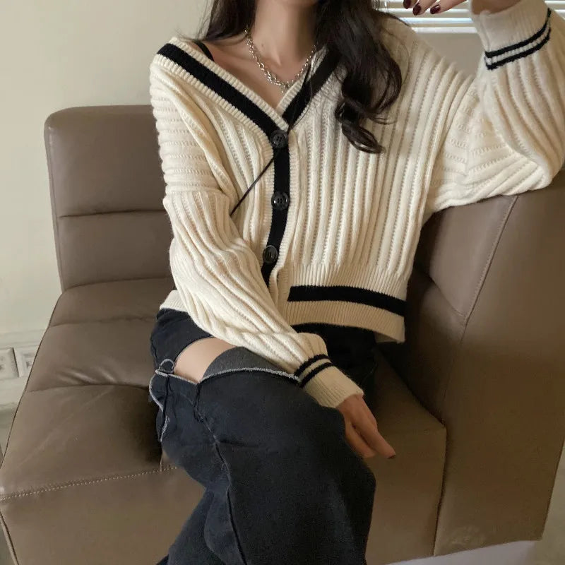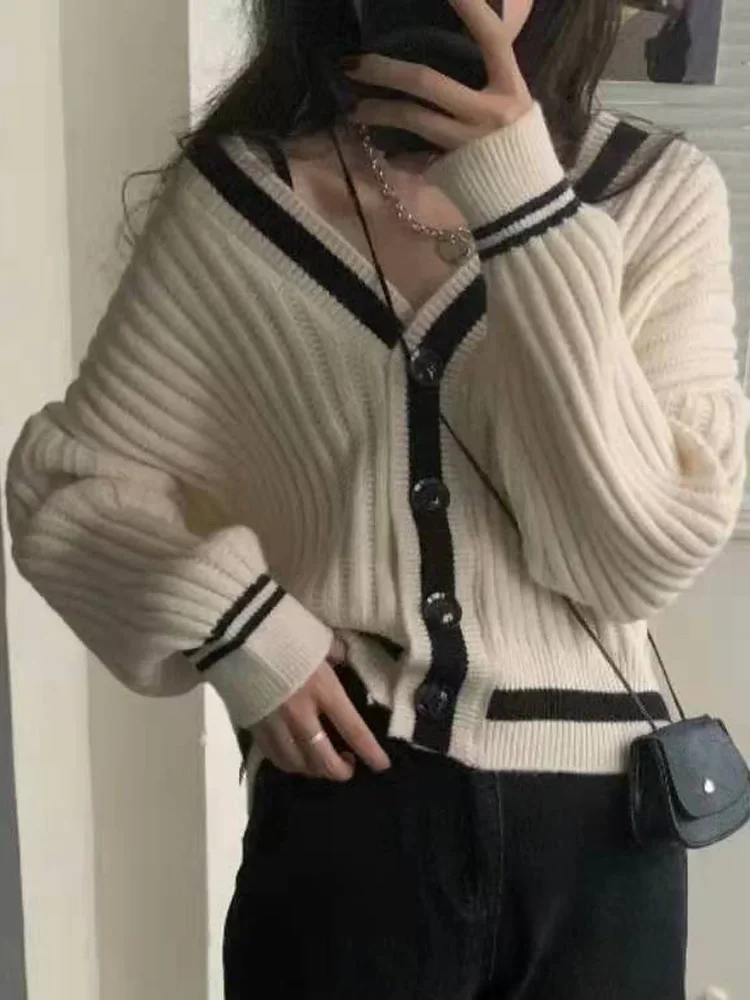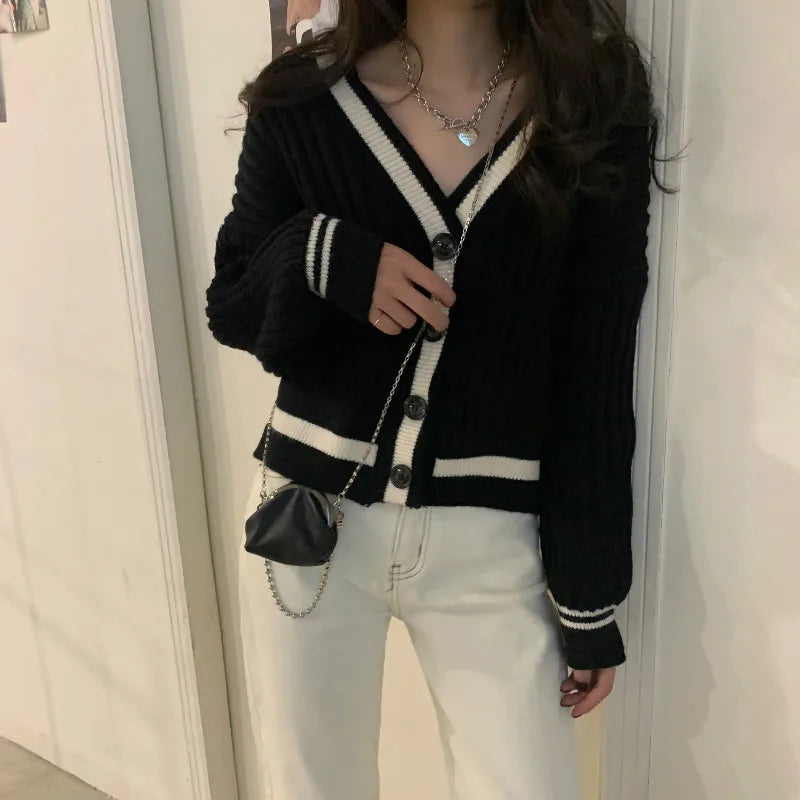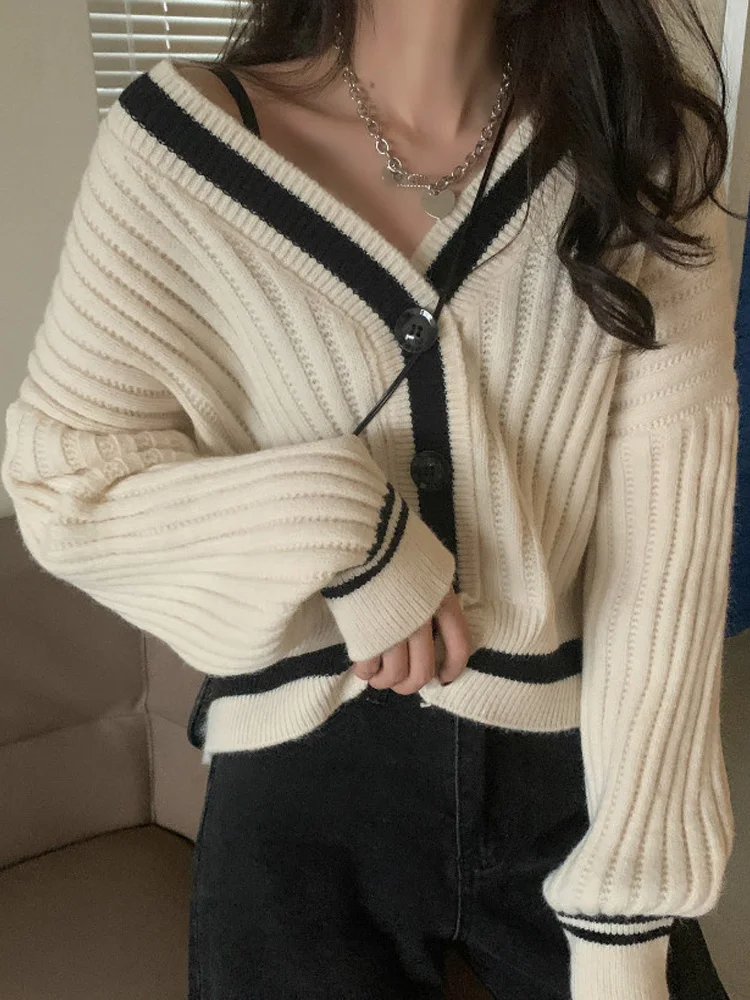 Loose V Neck Striped Cardigan Sweater Coat Autumn Winter Casual Long Sleeve Knitted Korean Style Bottons Elegant Women's Clothes