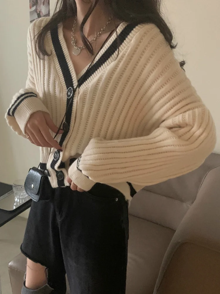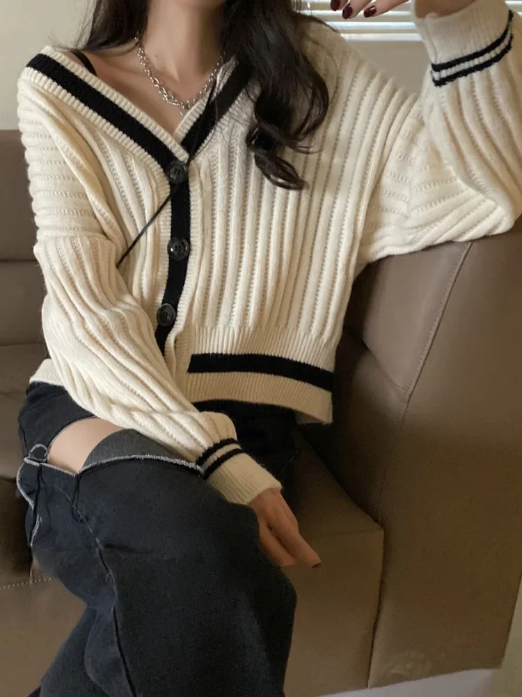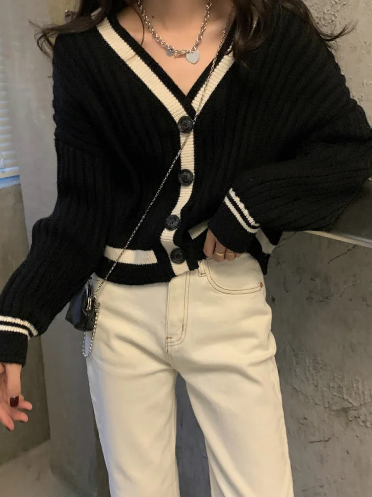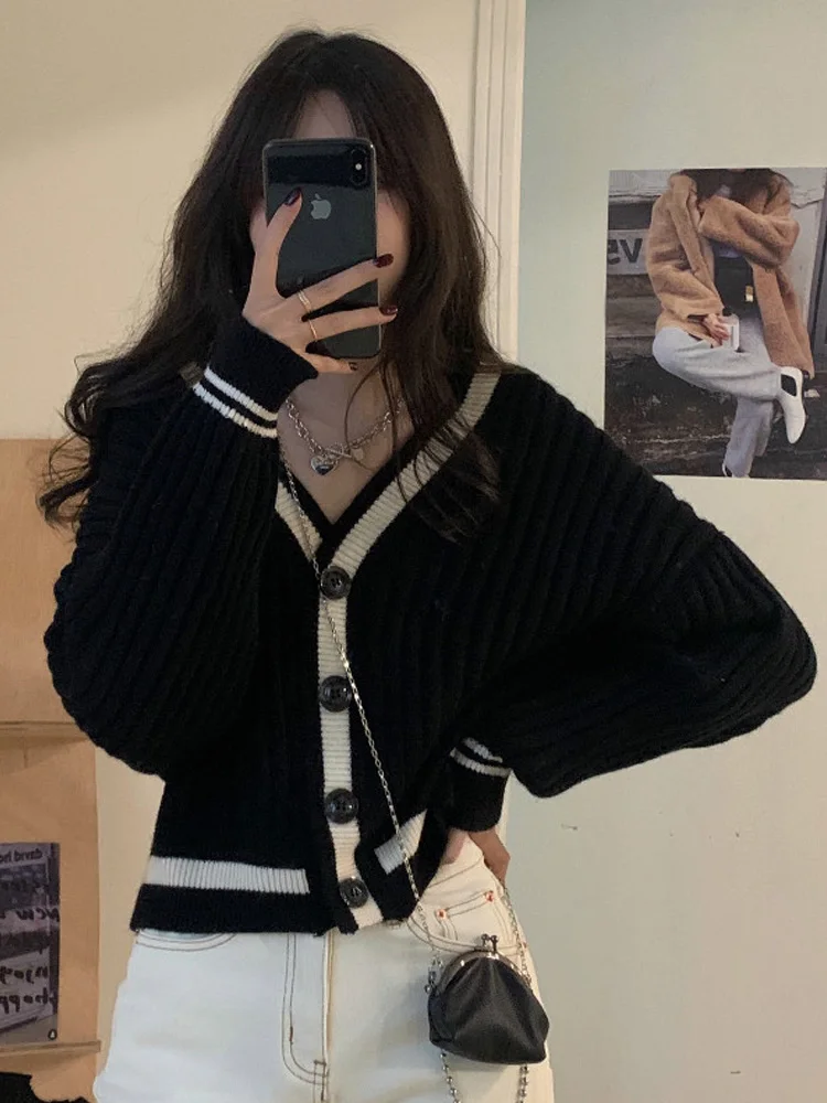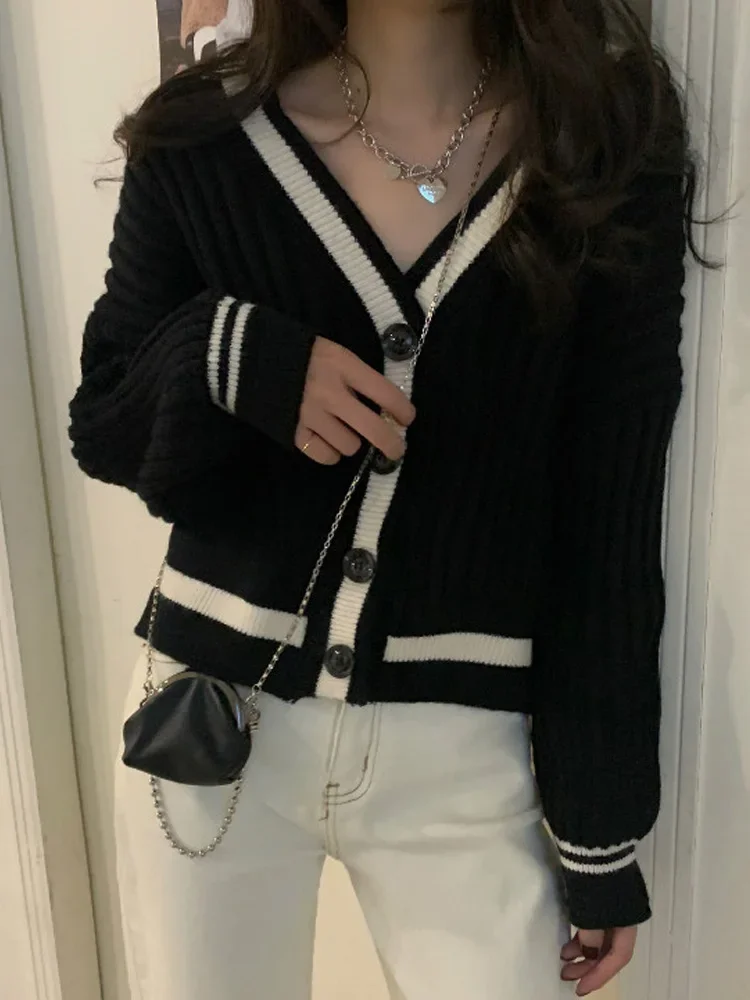 Loose V Neck Striped Cardigan Sweater Coat Autumn Winter Casual Long Sleeve Knitted Korean Style Bottons Elegant Women's Clothes